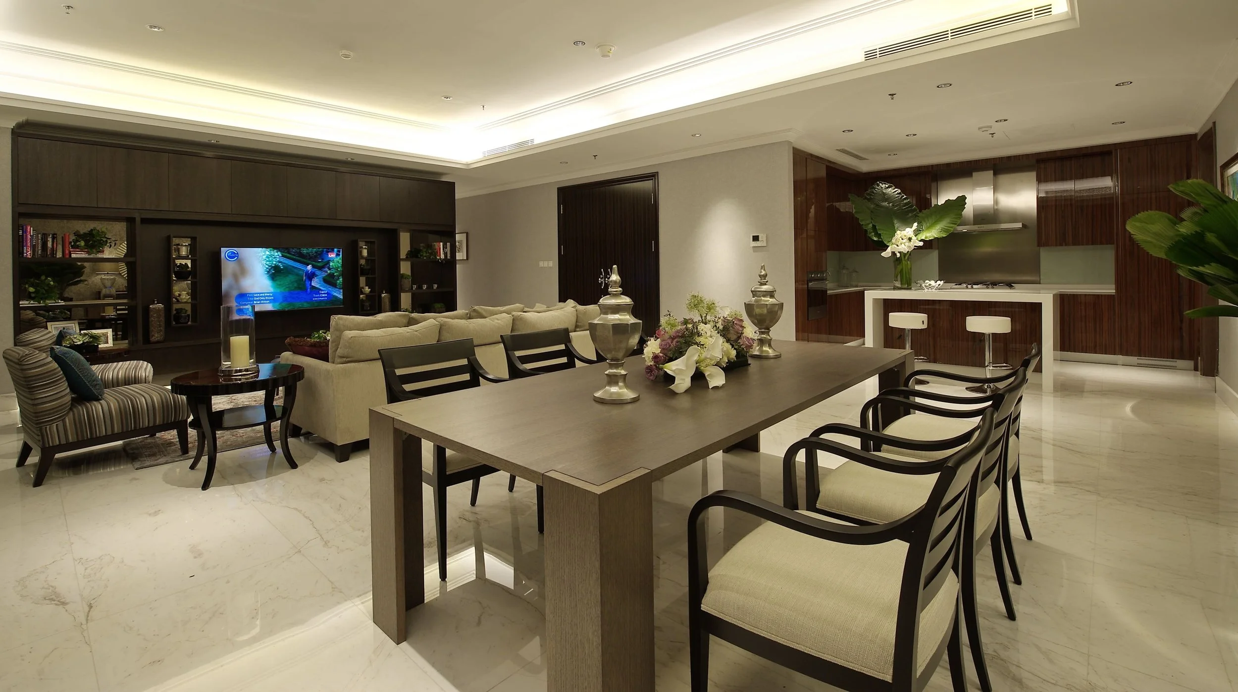 Light and materiality define each room. Dining areas are marked by sleek cabinetry and polished surfaces, while bedrooms are softened with draperies and subtle wallcoverings to create a quietly refined atmosphere.